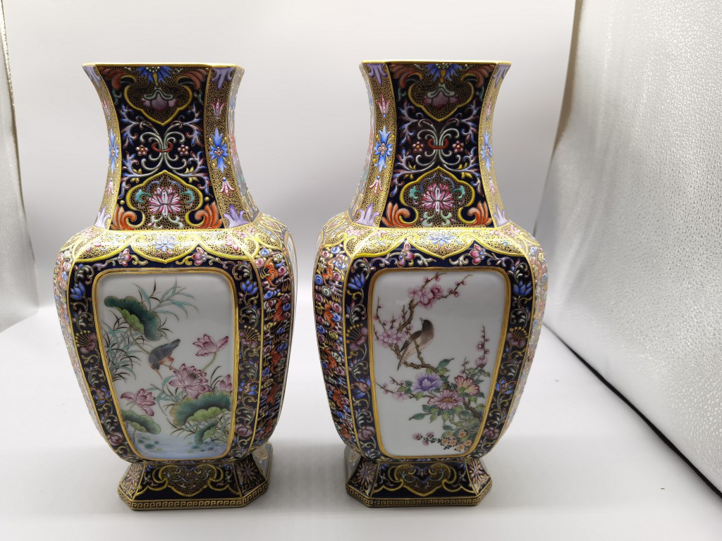 (清乾隆) 磁胎洋彩青地金花魚遊轉(zhuǎn)心瓶